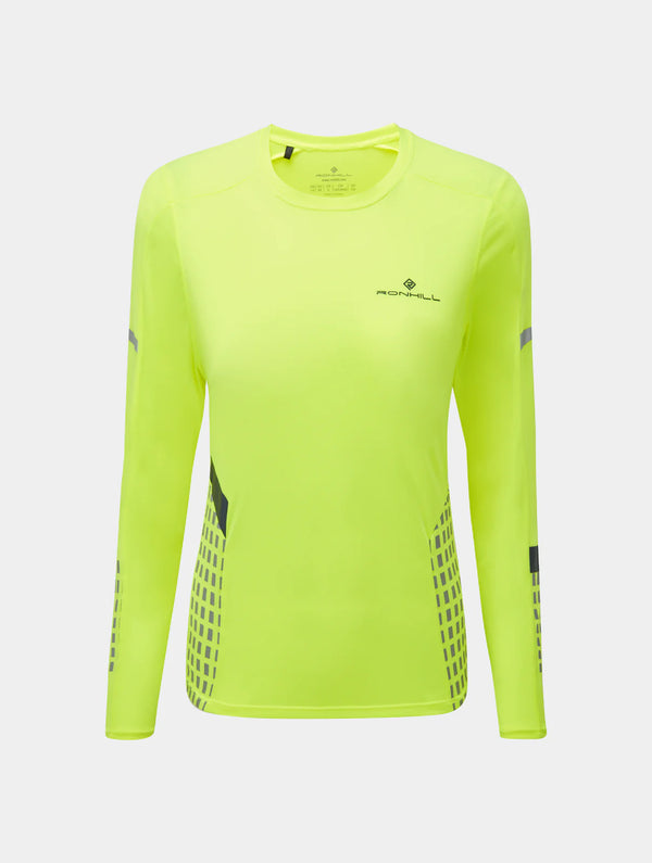 Lights out, game on. The Afterhours long-sleeve top is the perfect layer up for our Afterhours jacket, providing high-tech performance for low light conditions. Ronhill have been pioneering the use of reflective materials since the 1980’s and continue to stitch safety features into our cutting-edge performance running kit. Reflective, lightweight and high-wicking, this top will keep you warm, comfortable and seen as you flypast the streetlights. Reflectivity is provided by iridescent strips and a screen print, giving 360° visibility when a jacket isn’t needed.